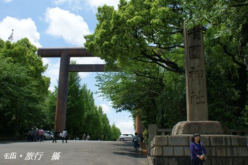 早稻田通右轉内堀通之後,看到前方有座大大鳥居時並不知道自己走到哪一座神社,總之凡見鳥居必有神社,經朋友告知才知道這是在中日政治圈裡充滿諸多爭議的「靖國神社」。到這裡,我們完全沒有進神社參拜的念頭,這非關政治,而自己一向陌視政治(個人覺得那是腐蝕人性的貪婪產物)。反正,我確實看到了一座截至目前為止算是最高大的鳥居,不走進去是因為我們都發懶不想再走一段長路,拍了幾張「Elli與大鳥居之間的比例關係圖」後隨即閃人離開。為了證明我有踏上那塊範圍,所以循往例拍一張「到此一遊」照。